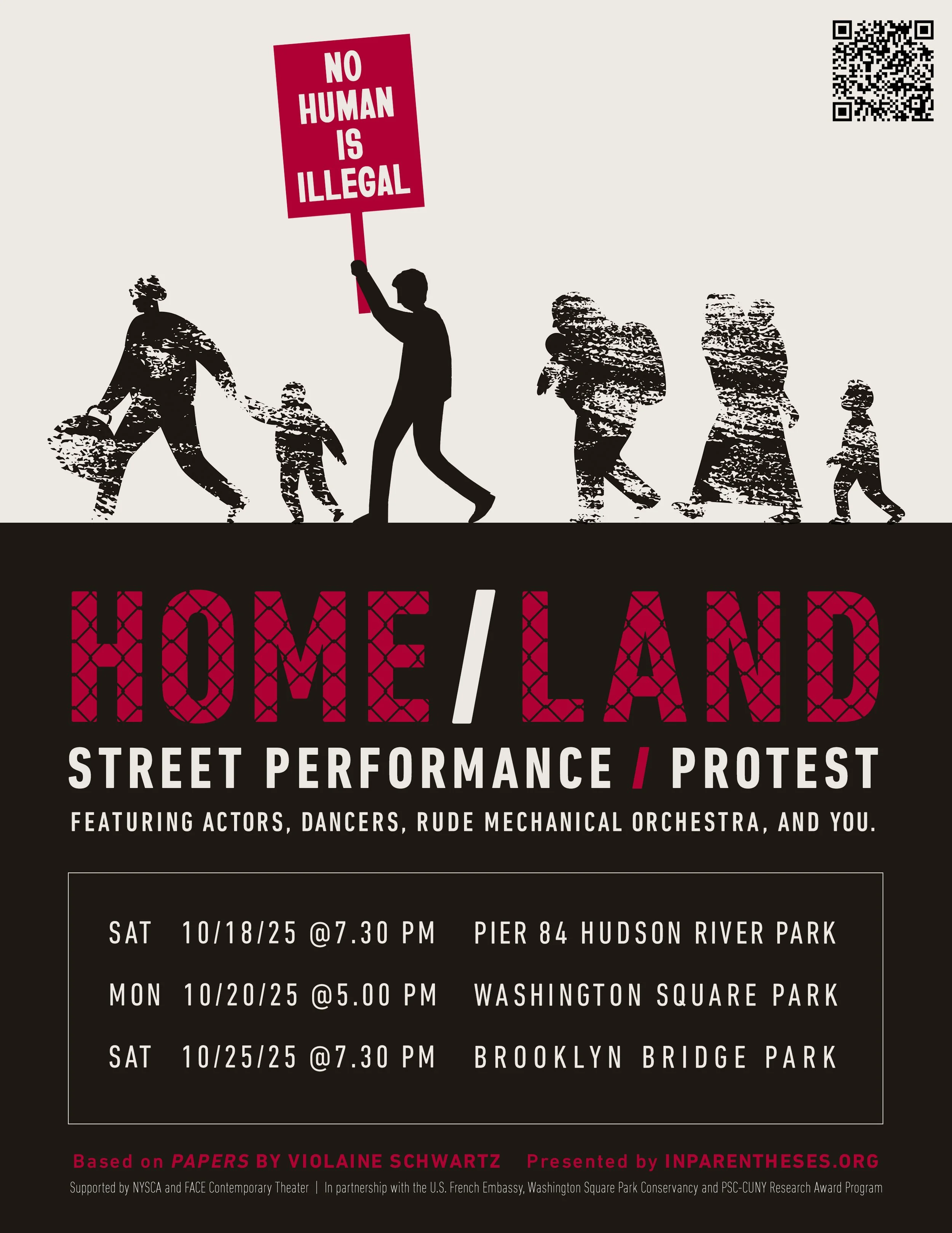 HOME/LAND examines the United States’ divided political climate around immigration, as well as the lived experiences of immigrants. Performers embody chanting protestors, immigration officers conducting interrogations, and refugees recounting real-life stories. This joyful and powerful theatrical performance is led by the Rude Mechanical Orchestra, and culminates in a dance, as images of New Yorkers and refugees are displayed on surrounding buildings and banners. By blurring the lines between demonstration and performance, opposition and support, refugee and citizen, HOME/LAND presents a face-to-face confrontation with the struggle for the right to live in a new home / land.